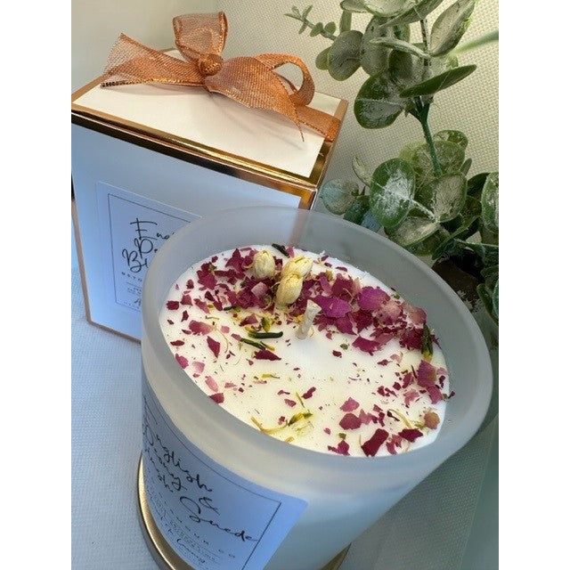 Indulge your senses and feel the warmth of succulence in creating unforgettable moments with 'The Boudoir Collection' Beautifully presented in frosted white glassware with a rose gold lid and handcrafted flowers.