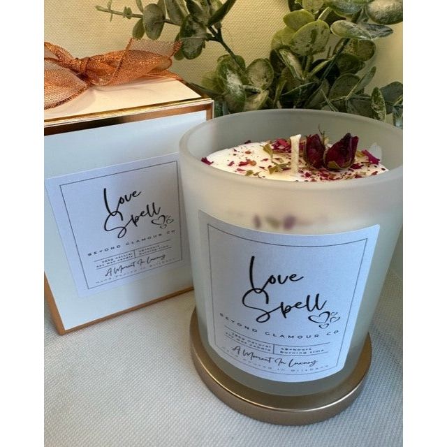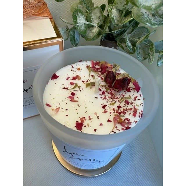 Indulge your senses and feel the warmth of succulence in creating unforgettable moments with 'The Boudoir Collection' Beautifully presented in frosted white glassware with a rose gold lid and handcrafted flowers.