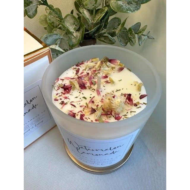 Indulge your senses and feel the warmth of succulence in creating unforgettable moments with 'The Boudoir Collection' Beautifully presented in frosted white glassware with a rose gold lid and handcrafted flowers.