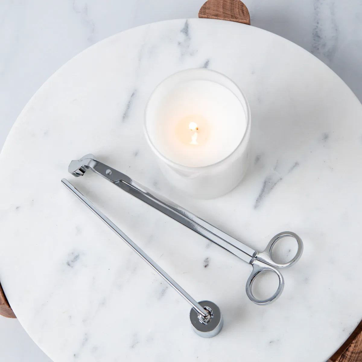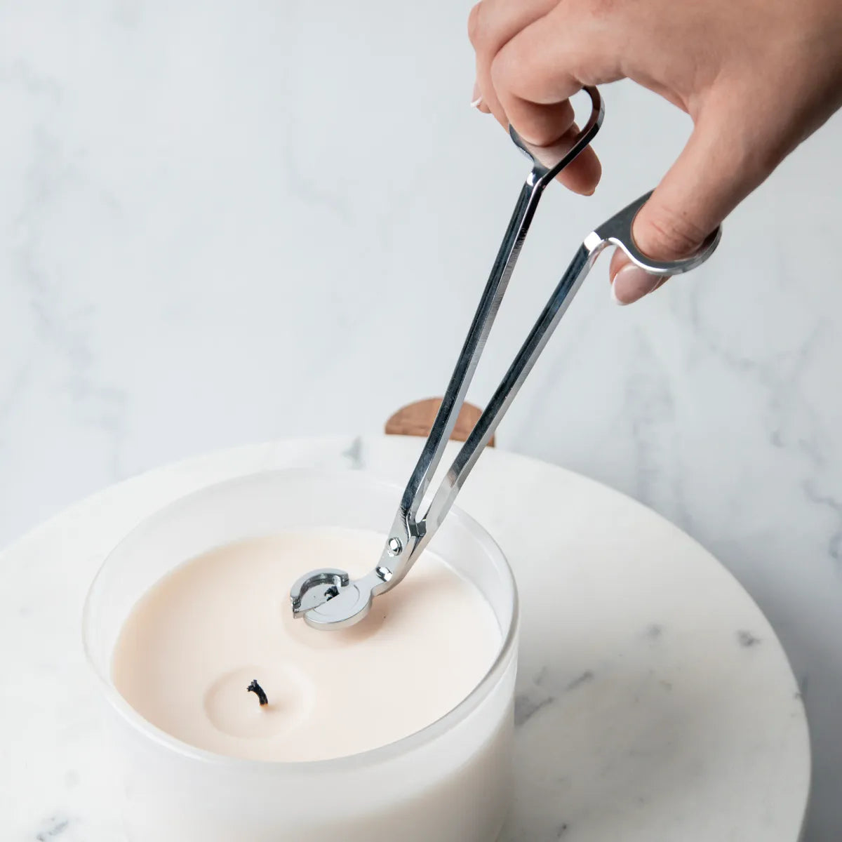 The Wick Snuffer extinguishes candles without blowing out the flame, preventing wax splatters and smoke.
