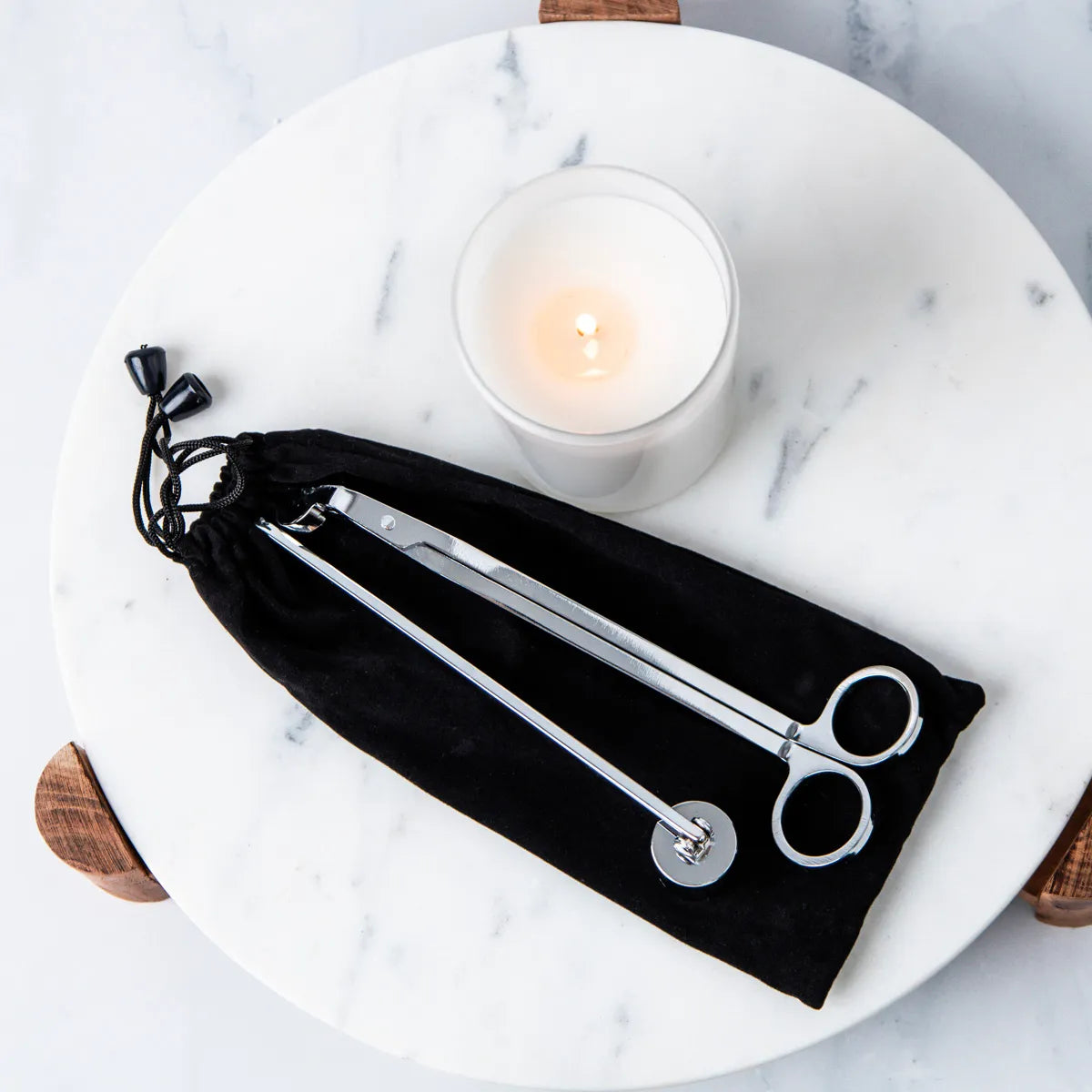 Our Candle Care Set is the ultimate kit for candle lovers, it includes a wick trimmer, wick snuffer, and black velvet bag presented in a white gift box to keep your candles burning beautifully.
