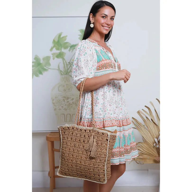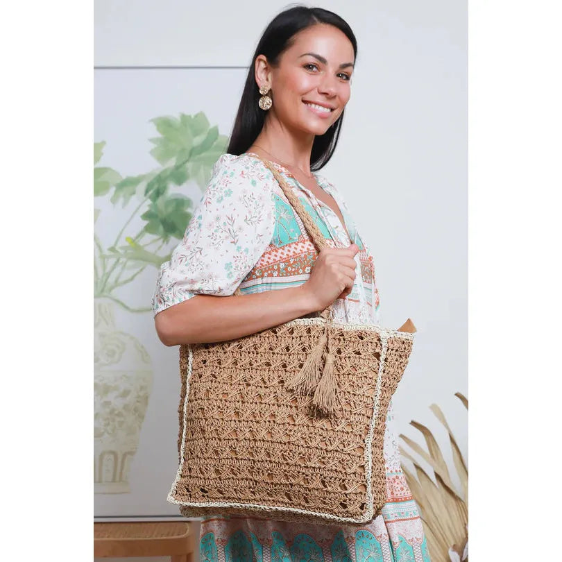 This boho-chic bag in hues of warm caramel is the perfect accessory for those effortless days. Crafted with raffia rope style straps and fully lined crochet raffia style outer. This bag offers plenty of room and convenience with its spacious size and zip closure and a small inner pocket to keep your essentials close.