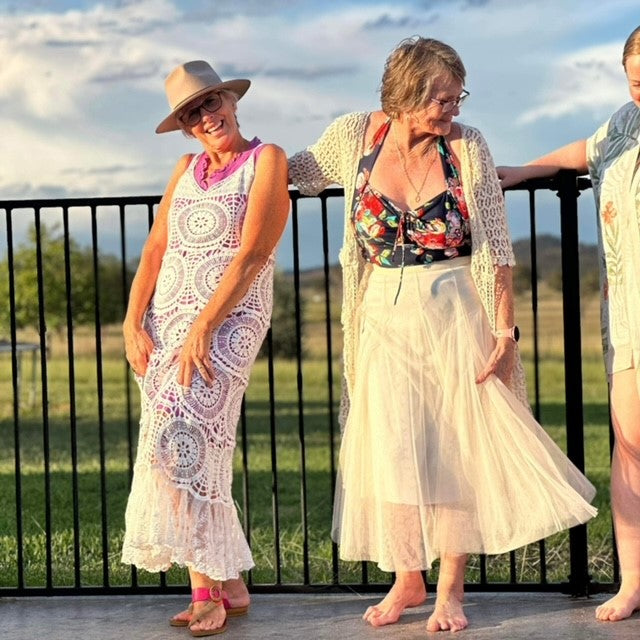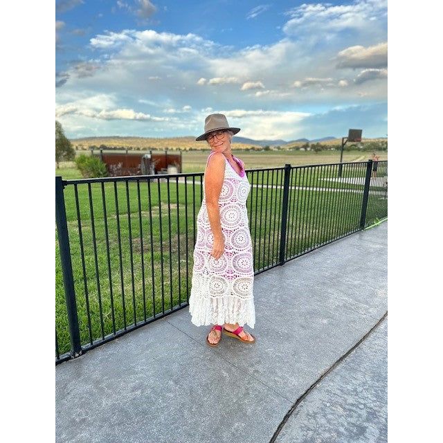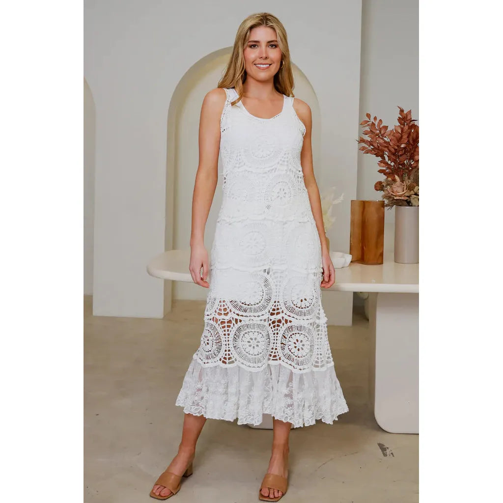Step into the world of carefree and stylish fashion with our lace collection. Crafted with a delicate touch, each piece features intricate lace crochet patterns that is effortlessly elegant. Our lace crochet mid length dress is the perfect blend of simple elegance and effortless style. This A-line beauty is designed to flatter while keeping you comfortable all day long. The delicate lace crochet details add a touch of sophistication, making this dress suitable for any occasion. The scooped tank neckline adds a subtle charm, giving you a relaxed chic look.