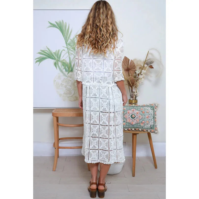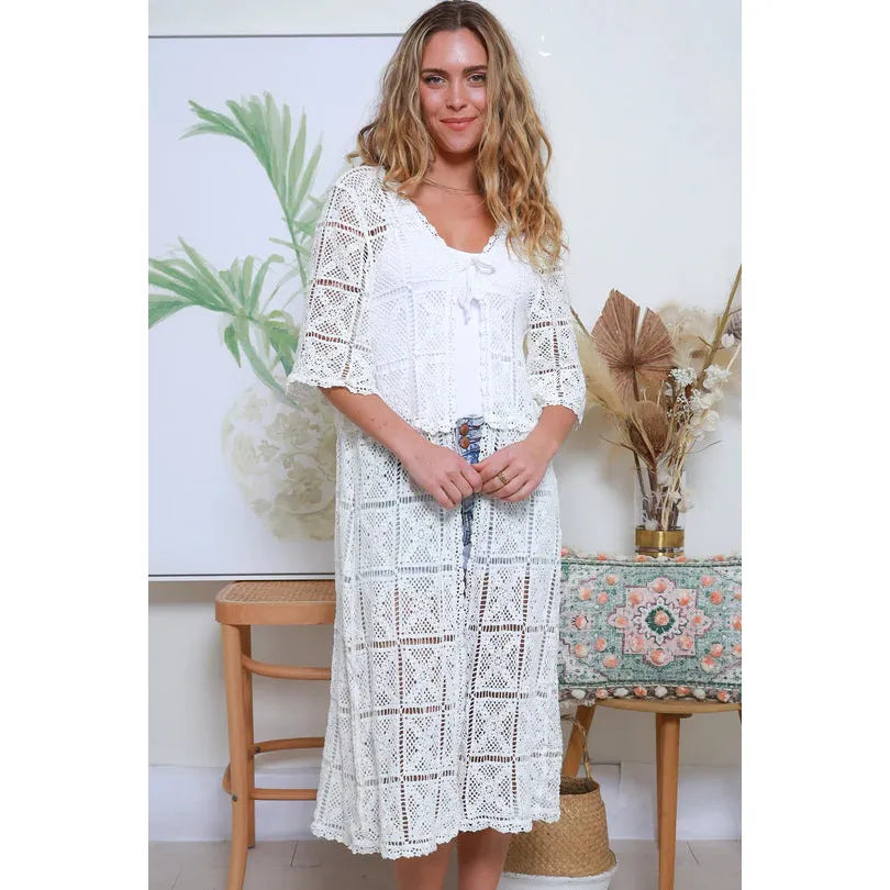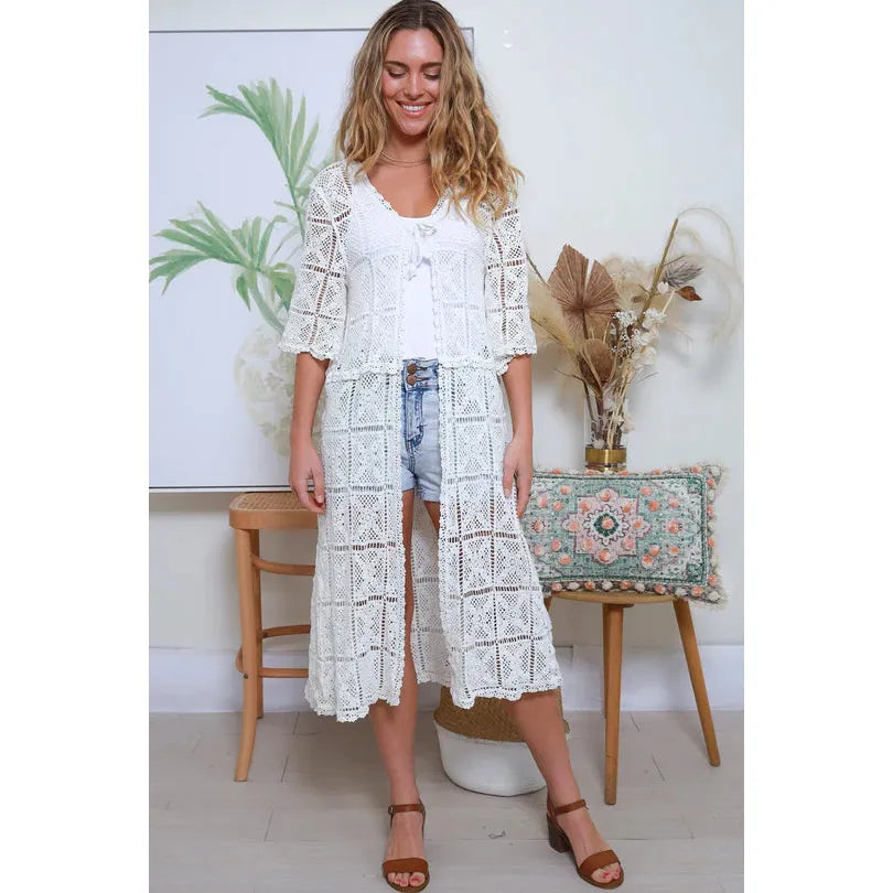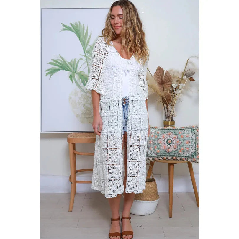 Step into the world of carefree and stylish fashion with our lace collection. Crafted with a delicate touch, each piece features intricate lace crochet patterns that is effortlessly elegant. This beauty features a single tie at the bust and an elegant mid calf length finish that is great for layering. Whether paired with a maxi dress or jeans and tank, this look is effortlessly chic that's perfect for leisurely days or just adding a little wanderlust to any outfit.