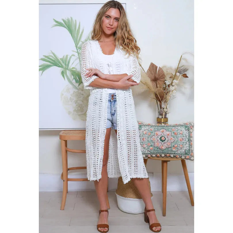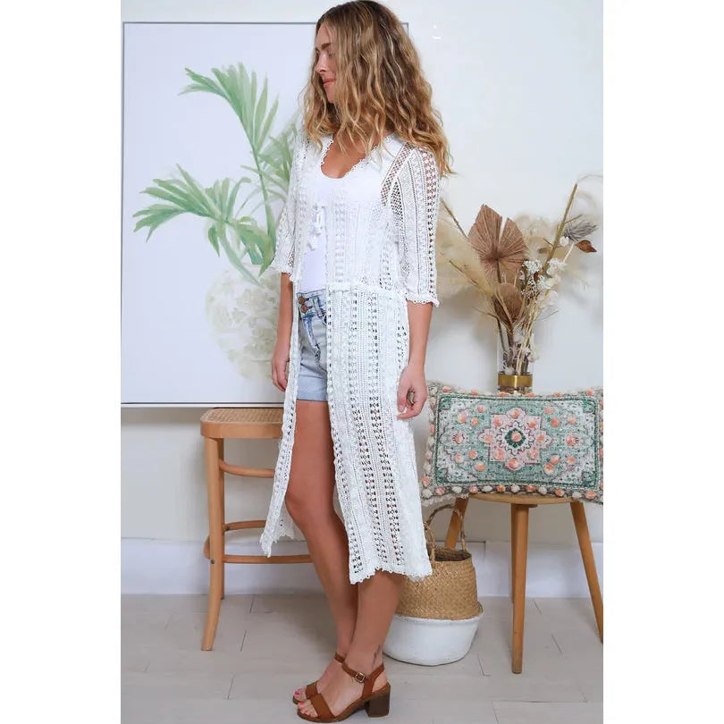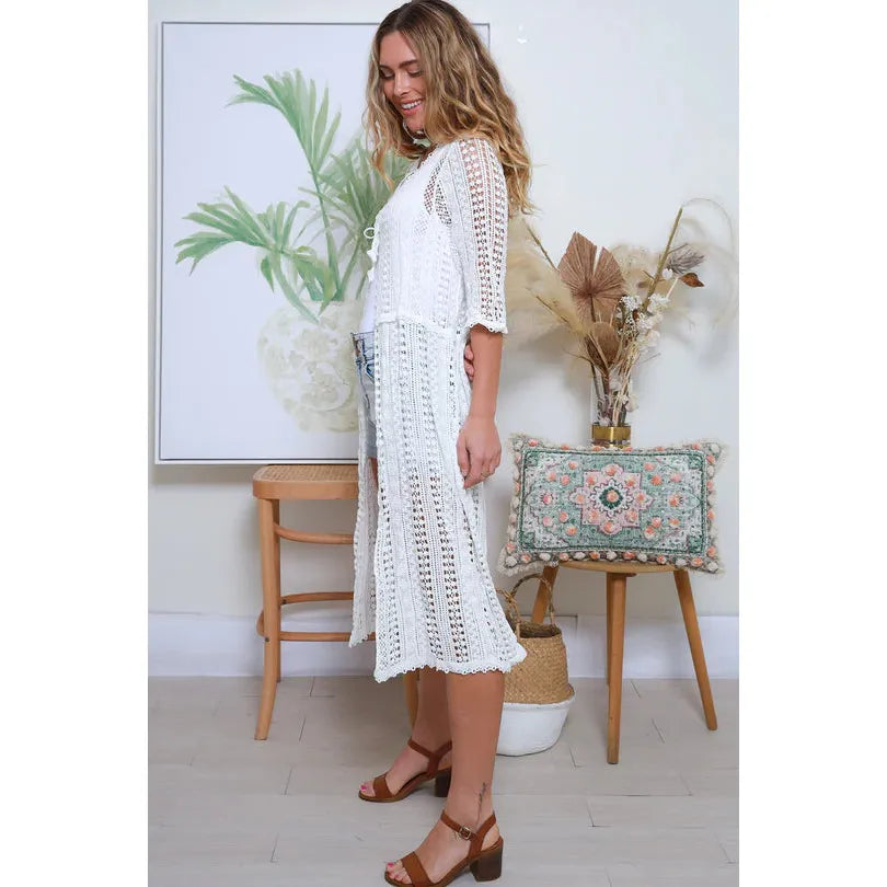 Step into the world of carefree and stylish fashion with our lace collection. Crafted with a delicate touch, each piece features intricate lace crochet patterns that is effortlessly elegant. This beauty features a single tie at the bust and an elegant mid calf length finish that is great for layering. Whether paired with a maxi dress or jeans and tank, this look is effortlessly chic that's perfect for leisurely days or just adding a little wanderlust to any outfit.