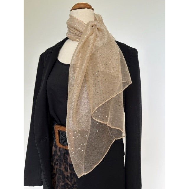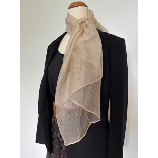 Wrap yourself in sheer elegance with our must have shawl in an enchanting latte hue and diamante, metallic finish. This lightweight accessory exudes style and versatility, making it a fabulous addition to your wardrobe for draping around your neck or over your shoulders for a gentle, flowing effect.